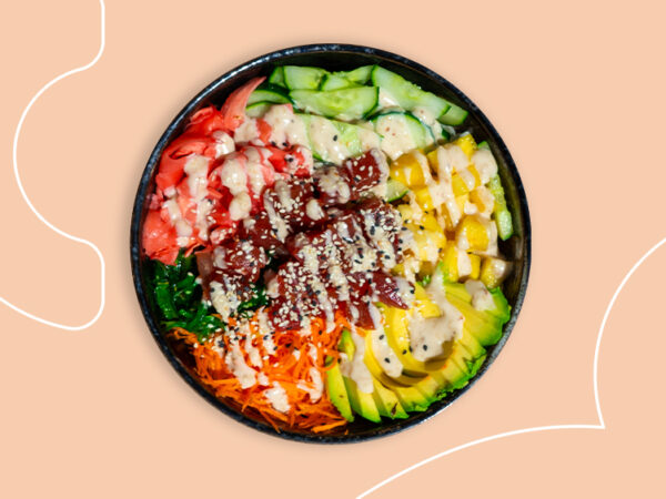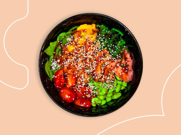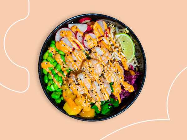 ( 1, 2, 3, 6 )Sushi ryža, sójová omáčka, mango omáčka, edamame, reďkovka, mungo klíčky, červená kapusta, poľníček, mango, krevety, sriracha majonéza, limetka
