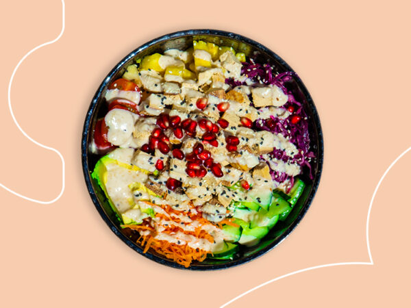 ( 1, 3, 6, 8, 11 )Sushi ryža, sójová omáčka, sweet chilli omáčka , polniček, mrkva, edamame, ananás, rajčina, marinované kuracie mäso, teriyaki omáčka, mungo klíčky, oriešky, opečená cibuľka, granátové jablko